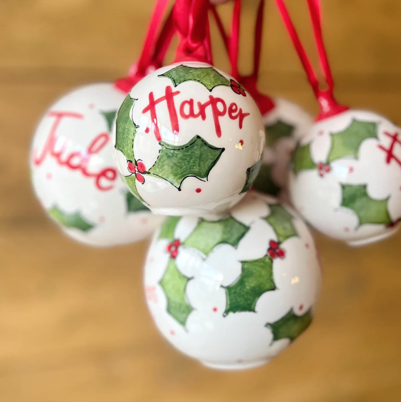 2. Hand painted holly baubles by Happy Glaze Pottery in Devon
