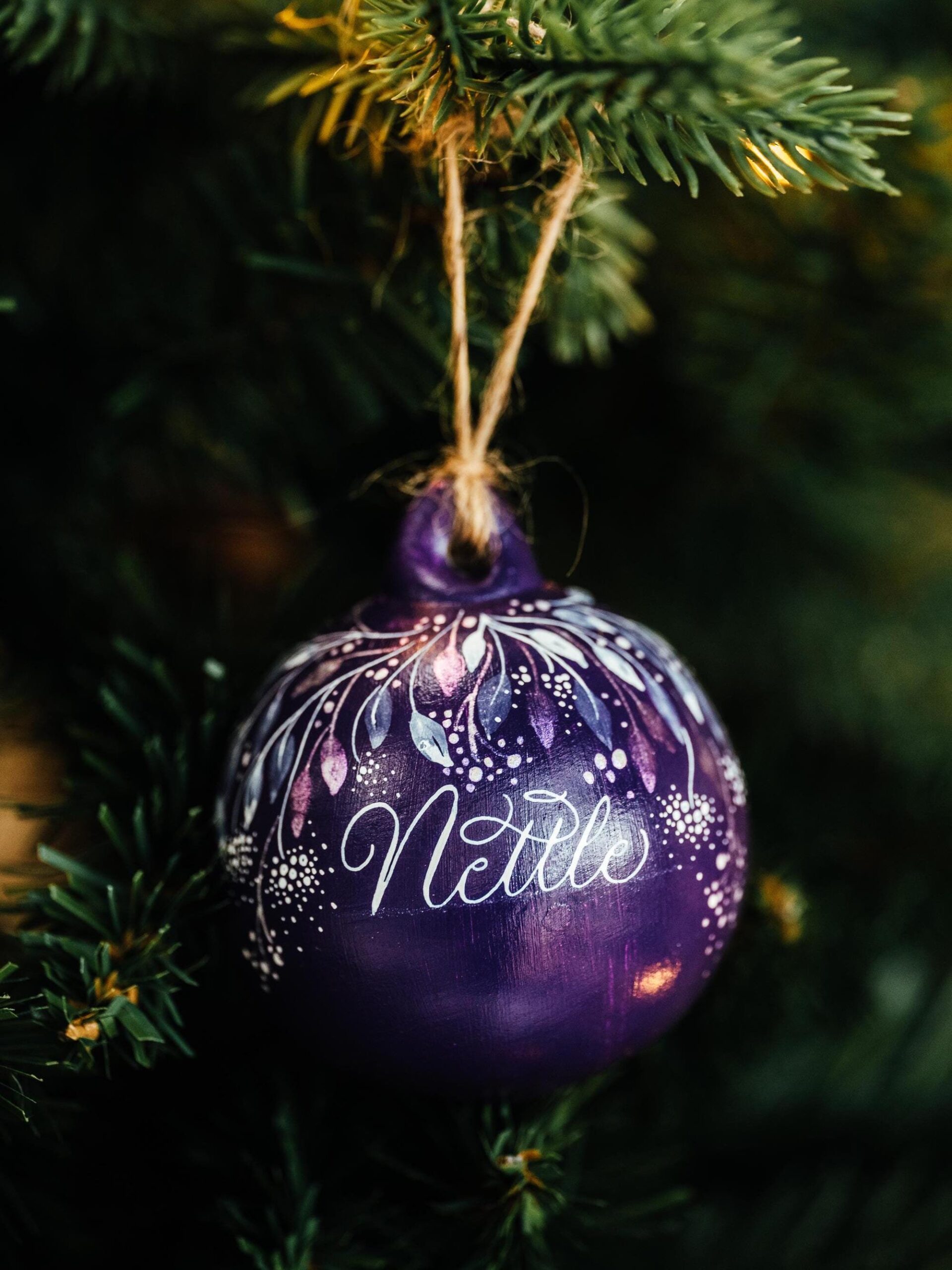 16. Rich purple calligraphy name bauble – By Moon & Tide UK