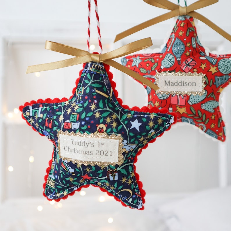 18. Liberty personalised heart star Christmas tree decorations by StitchedbySistersUK on Etsy