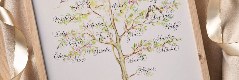 Family trees are one of the very, very best projects I get to work on as a calligrapher. I don’t approach them the same way a 19th century scribe would have done: not at all! In the same way families have evolved, so should family trees. And while I do offer the kind of family …